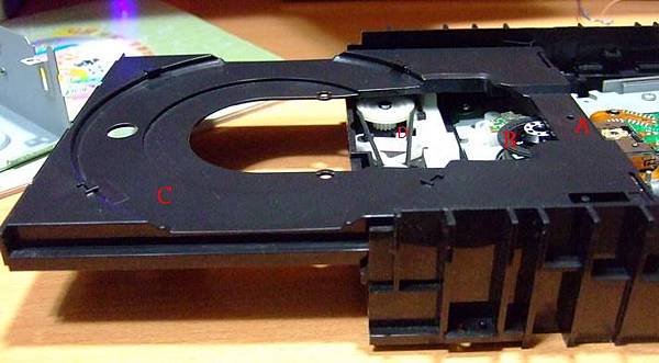 (1)先把皮帶從光碟機裡拿出來,簡易法為用針把光碟機托盤刺出來,將托盤拉到底,就可看到皮帶,即可進行拆換