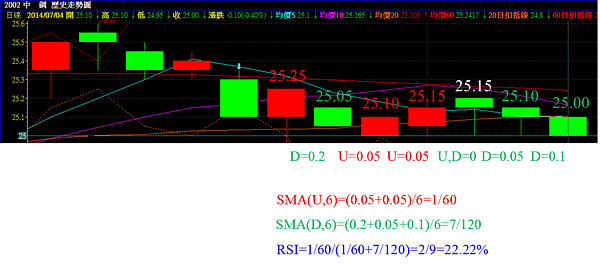 上圖顯示中鋼RSI6的值為22.22%,表示最近6天的下跌力道較強。
